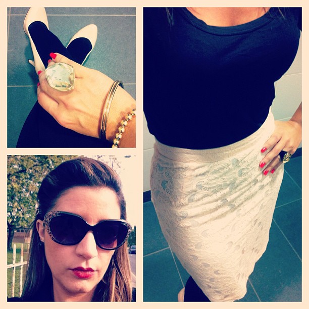Black top (H&M), nude lace skirt (H&M), nude court shoes (M&S), nude hexagonal ring (New Look), black and gold ring (Sobral).