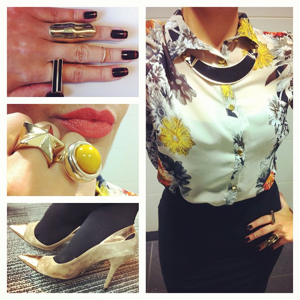 Floral blouse (Primark), black pencil skirt (H&M), taupe gold captoe shoes (Viviana), rings (mustard H&M, star – Primark, gold knuckle – H&M, resin – Sobral, above the knuckle – Lovehearts and crosses, bars – Primark), necklace (Primark), Kiko lipstick (it was bought on their sale, has no number, or name, it is quite orange and matte, I put a little bit of Vaseline on top).