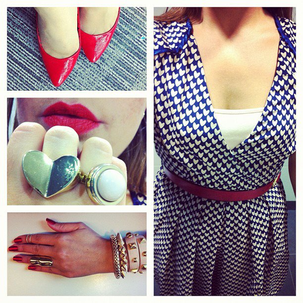 Navy and nude heart print dress (Little Mistress), red patent court shoes (New Look), heart ring (Forever 21), nude round and large over the knuckle rings (H&M), above the knuckle ring (eBay), MAC lipstick in Lady Danger.
