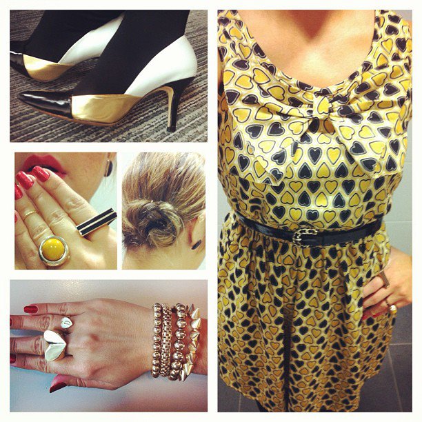 Black and mustard heart print ring (Primark), tricolour court shoes (Zara), rings (big heart – Forever 21, small D heart – Miss Selfridge, mustard – H&M, black bars – Primark), bracelets (mix of Topshop and New Look), Lancome lipstick in Hot stuff.
