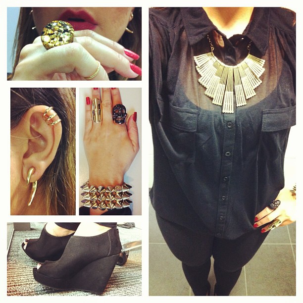 Black sheer shirt (Primark), black trousers (Zara), black peep-toe wedge booties (New Look), rings (skull – shop in Paris, gold knuckle – H&M, resin – Sobral, above the knuckle – Lovehearts and crosses), bracelet (New Look), earrings (News Look and ear cuff – Topshop), necklace (Primark), MAC lipstick in Odyssey.