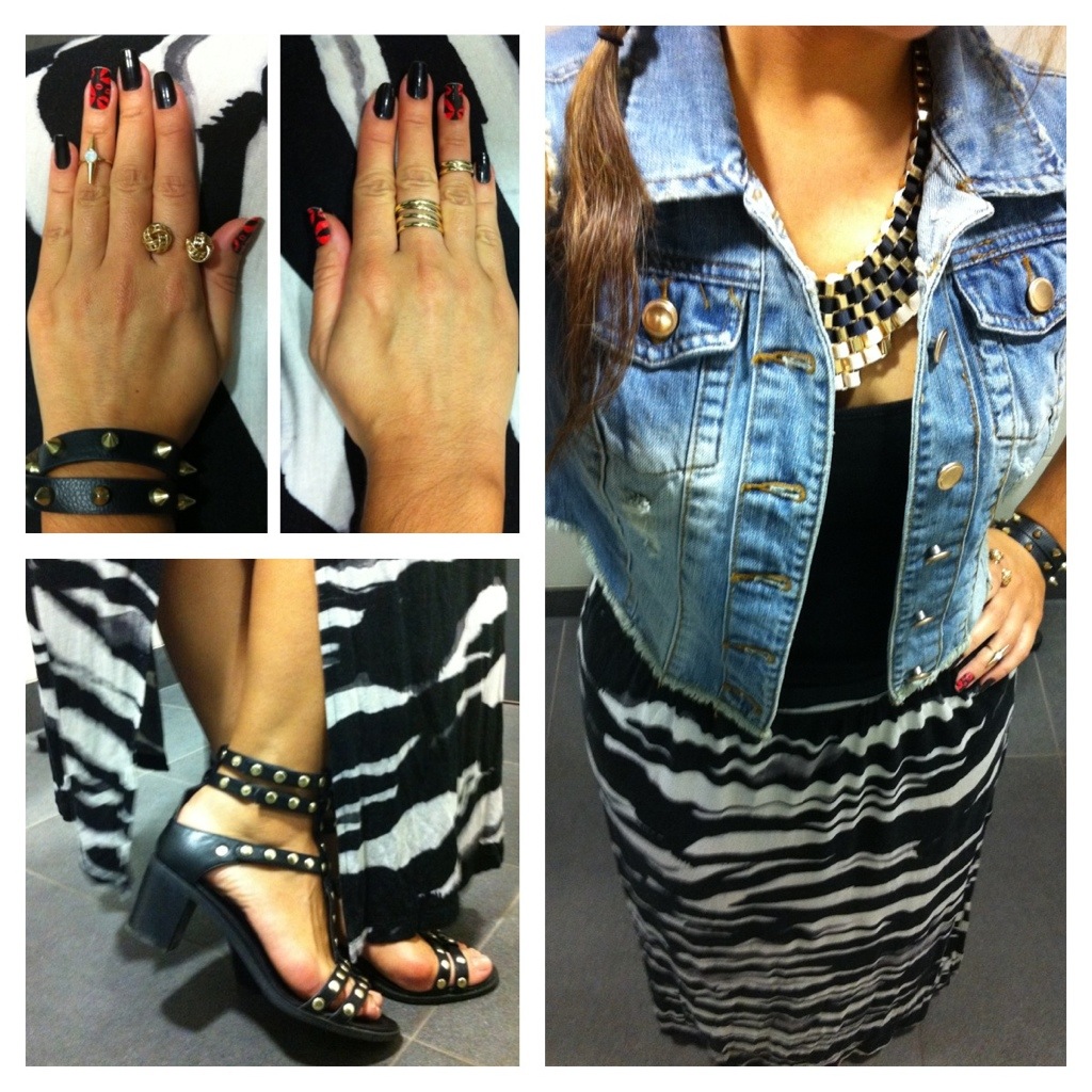 Black and white printed maxi skirt and black top from H&M, denim waistcoat from Primark, black studded block heel sandals from H&M, necklace from Little Birdie London, rings from Topshop and H&M.