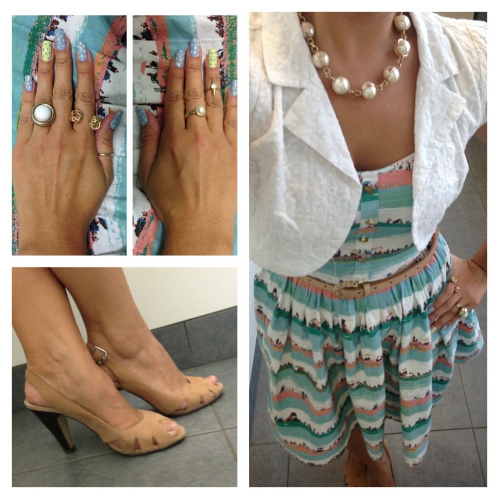 Beach scene print dress from Primark, nude slingback sandals from Topshop, broderie anglaise bolero from Brazil, necklace form Forever 21, rings from Forever 21, H&M and Topshop.