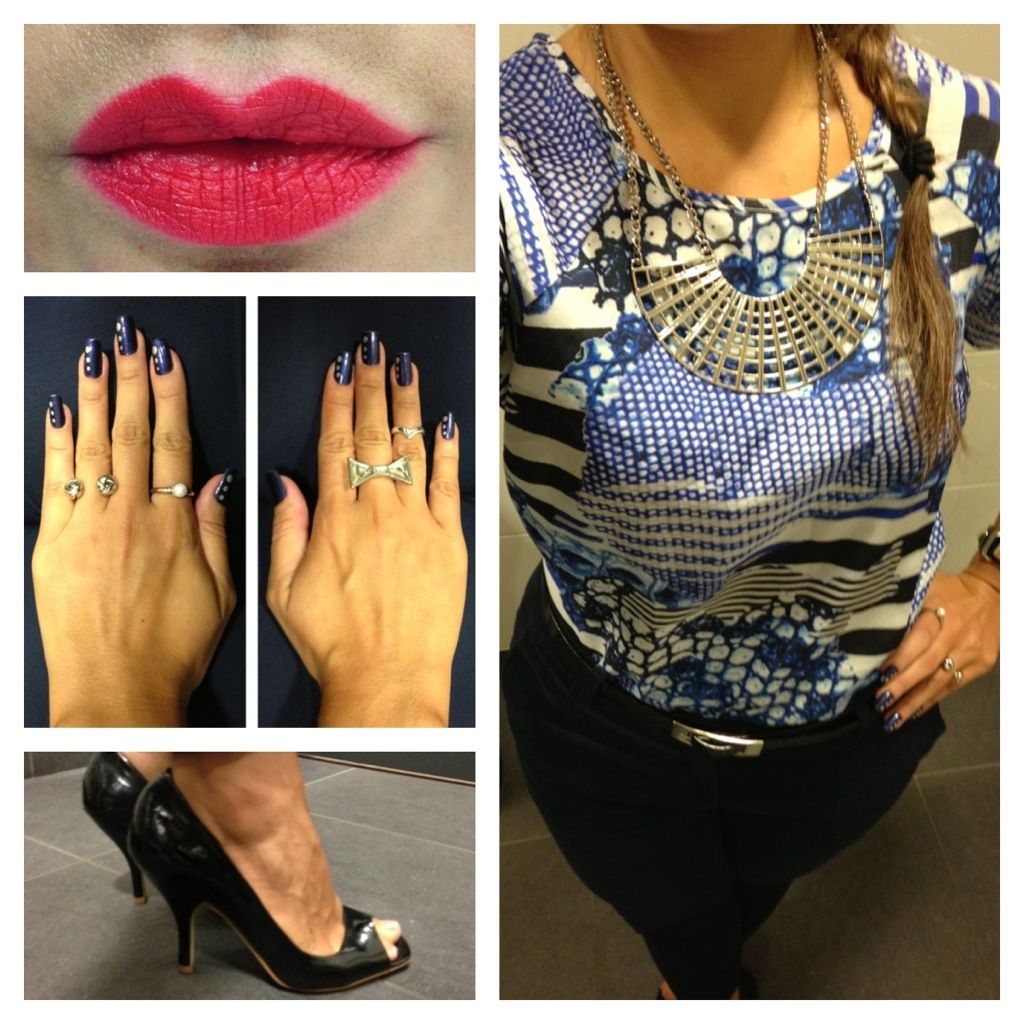Blue graphic print t-shirt from Primark, black cigarette trousers from H&M, black patent peep-toes from Ibiza, necklace from Primark, rings from H&M and New Look.