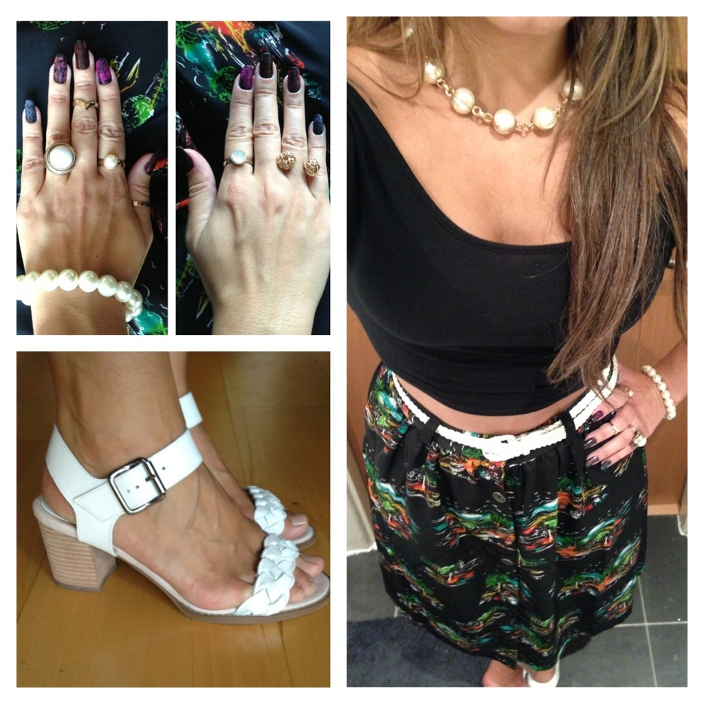 20130818-183120.jpgBlack crop top from Topshop, beqach print skirt from a little shop in Stratford (bargain alert!), white block heel sandals from Topshop, necklace from Forever 21 and rings from H&M and Forever 21. 20130818-183133.jpgBlack, white and grey tartan blouse from Primark, black skater skirt from H&M, black patent court shoes from River Island,  rings and bracelet from New Look. 20130818-183146.jpgBlack and white carton print crop top from primark, black trousers from H&M, white stilettos from River Island, necklace from Primark, bracelet from Miss Selfridge and  rings from H&M, Primark and Forever 21.