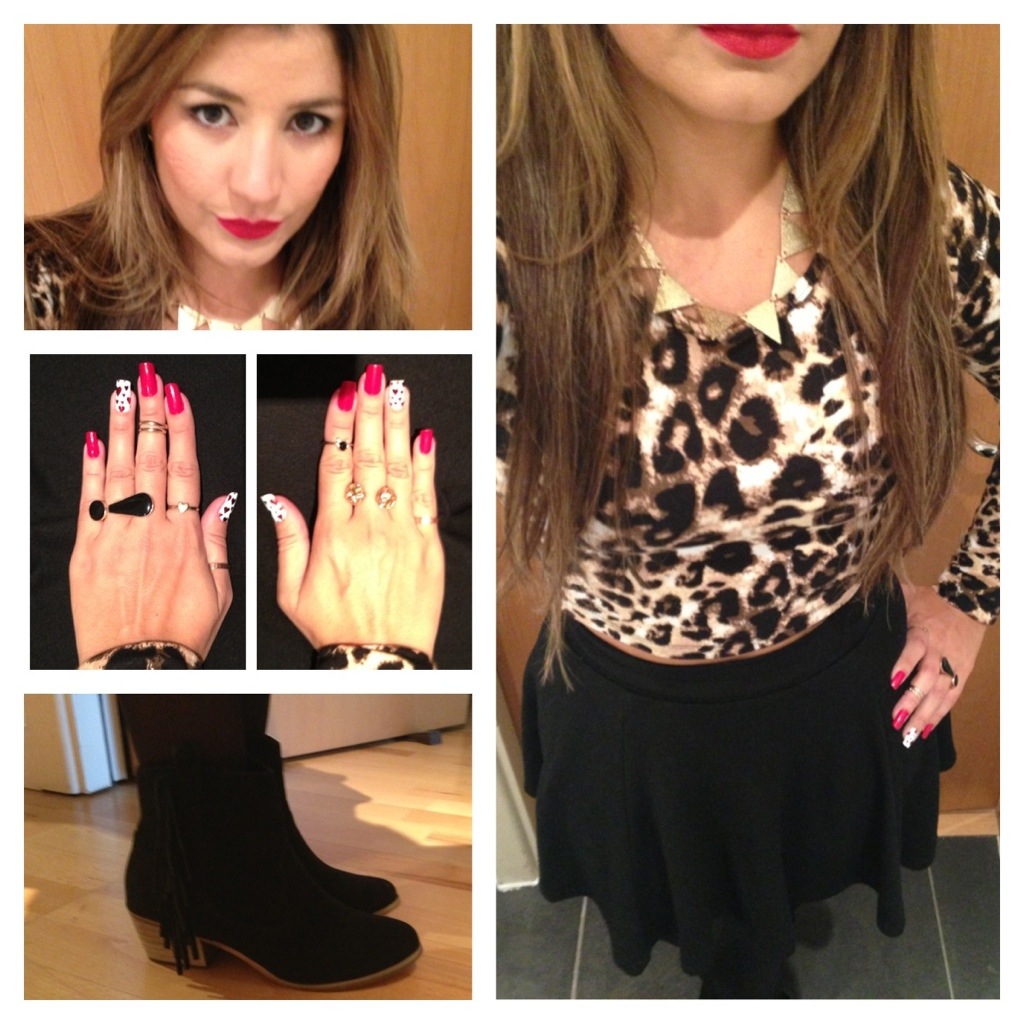 20130818-183211.jpgLeopard print crop top from Primark, black skater skirt from H&M, black fringed booties from Primark, necklace from Topshop and rings from H&M, Topshop and Primark.