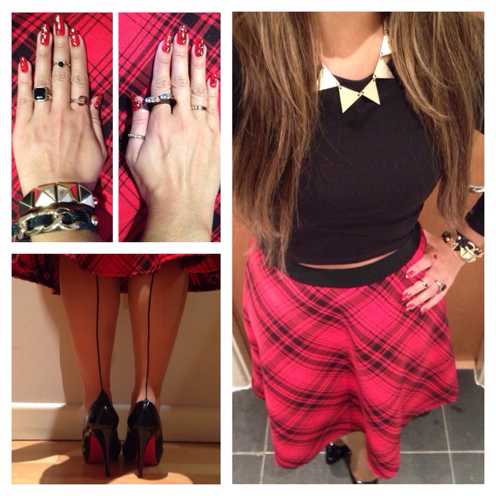 Black skater skirt from H&M, red tartan turtle neck crop top, fringed ankle boots, red socks and bracelet from Primark, rings from Sobral, New Look, H&M and Forever21.