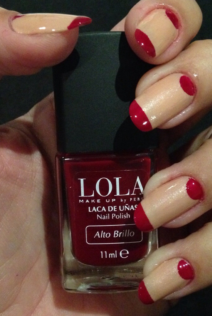 I used L’Oréal Color Riche in Macaron Noisette (the most beautiful nude ever to grace my talons) as a base – two coats are sufficient. When dry, I used a hole re-enforcer as a guide for the half moon and French manicure guides for the tips, splashing them red with the beautiful Brilliant Red from Lola. This red is fantastic. It is sheer but almost cream and the coverage is excellent – so pigmented. The colour is great – a deep, vivid blood red. I love it and will certainly be using is on its own.