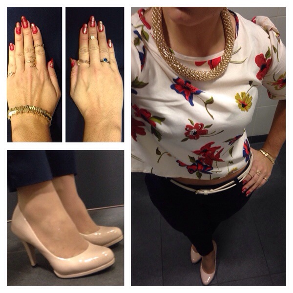 Floral crop top from Primark, navy trousers from H&M, nude court shoes from Marks & Spencer, necklace from Primark, bracelet from H&M, rings from H&M, New Look and Topshop.