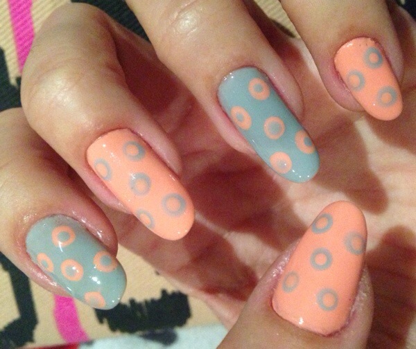 I painted a nail each colour, alternately, and then dotted with the other colour. Then I went over the dots, dotting with the base colour on the nail.