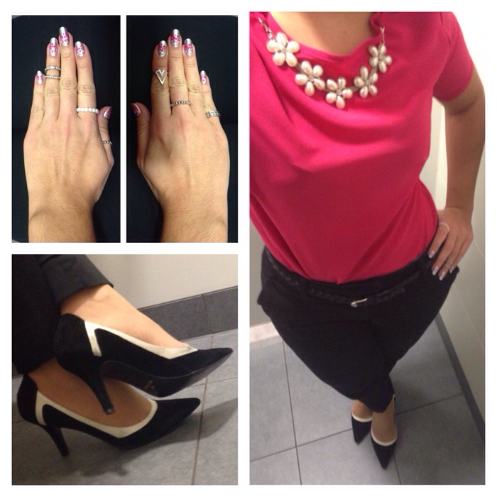 Pink top with silver necklace from Primark, black trousers from H&M, black and white court shoes from Viviana calçados, rings from Primark, New Look and Topshop.