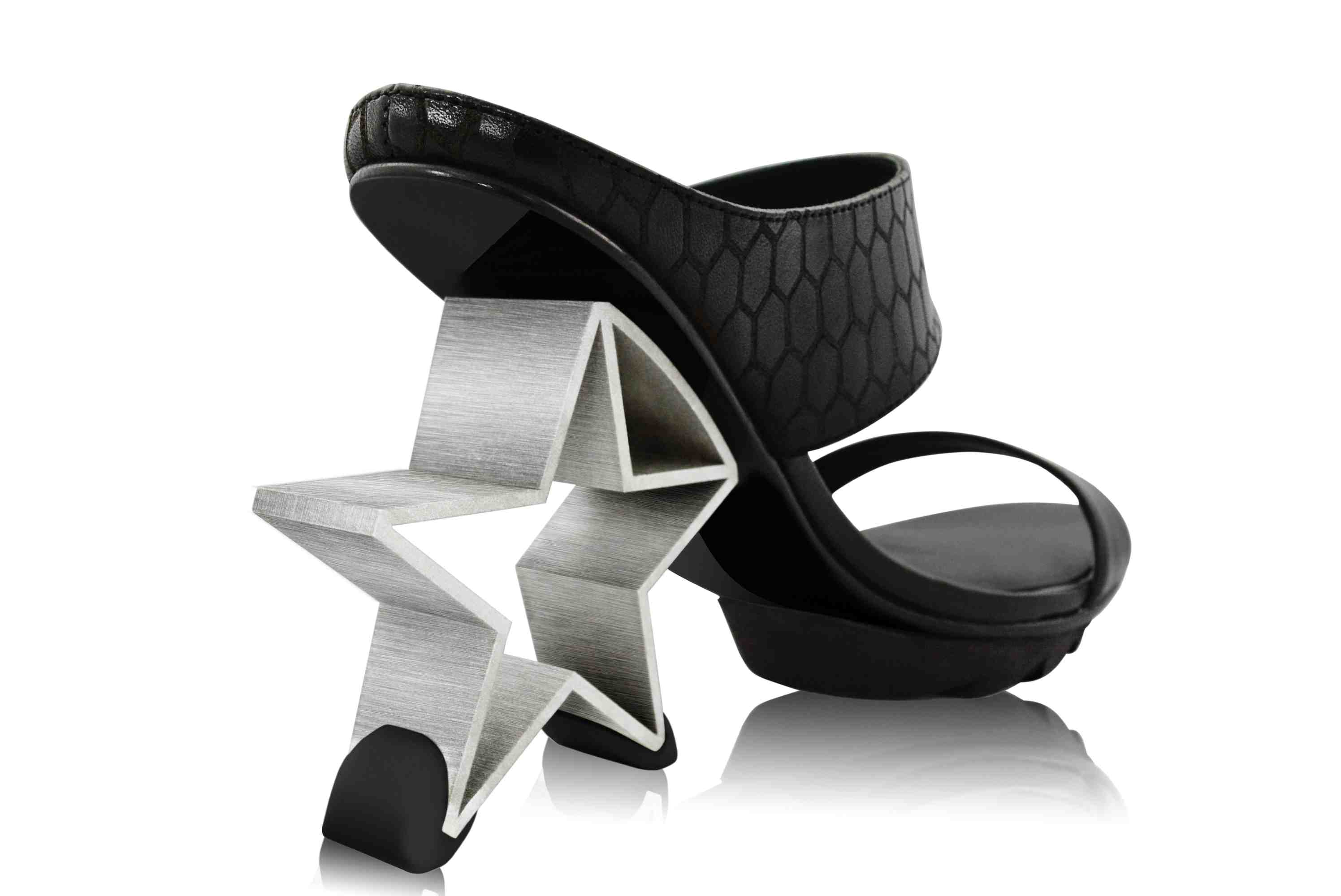 The star heel is milled from a solid piece of aluminium using a high frequency electric process, giving the heel strength and lightness. I really like the different textures (which can be seen on the Black Widow’s catsuit) and the tough sole.