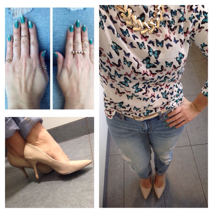Butterfly top from Bershka, distressed bf jeans from Forever 21, nude court shoes from New Look, necklace from New Look, rings from H&M, Topshop and New Look.