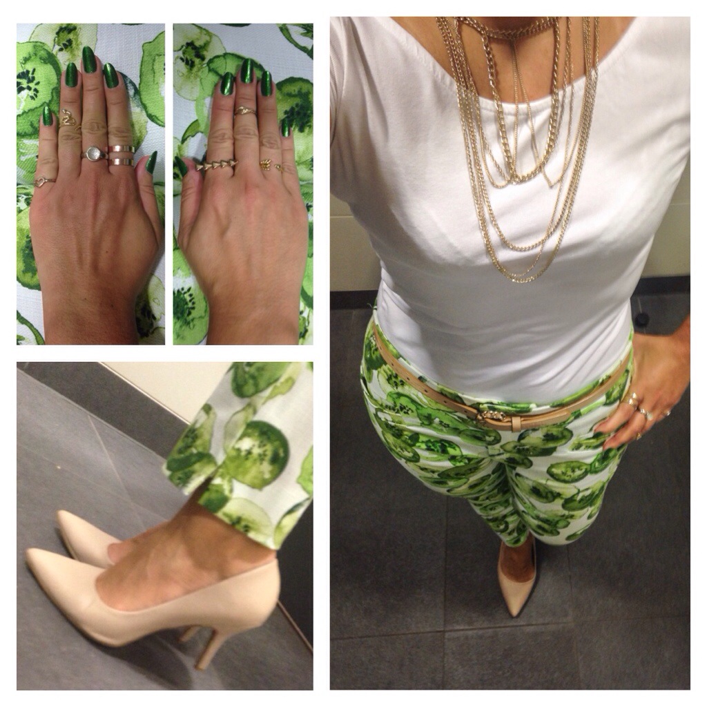 Kiwi fruit print trousers from Zara, white top from H&M, nude court shoes from New Look, necklace from Miss Selfridge, rings from Forever 21, H&M, Stella & Dot and Topshop.