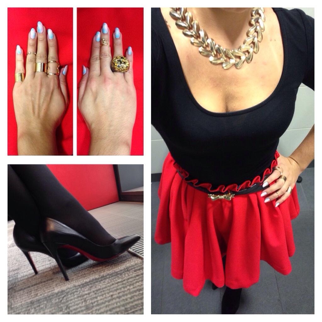 Red skirt and black top from H&M, black court shoes from Christian Louboutin, belt from Primark, necklace from New Look, rings from H&M, Sobral and Forever 21.
