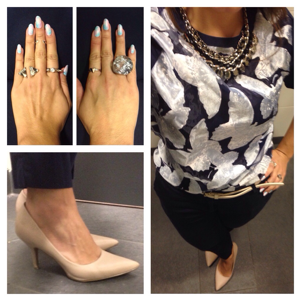 Navy butterfly top from Primark, navy trousers from H&M, nude court shoes from New Look, necklace from Primark, rings from Sobral, Primark and H&M.