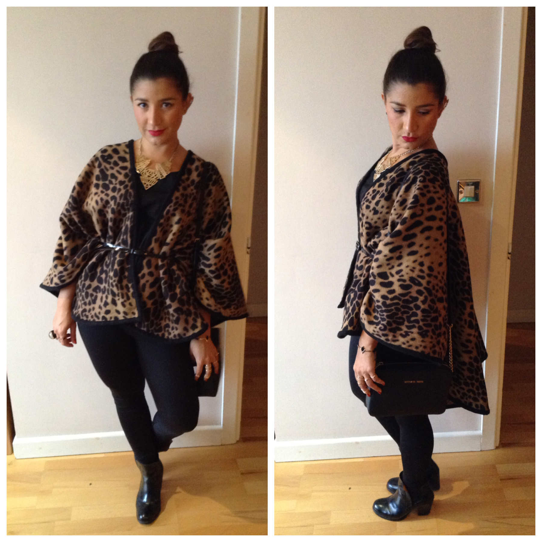Leopard print blanket wrap from Oasis, black leggings from H&M, black vest from Primark, black ankle boots from H&M, bag from Michael Kors, necklace from Primark.