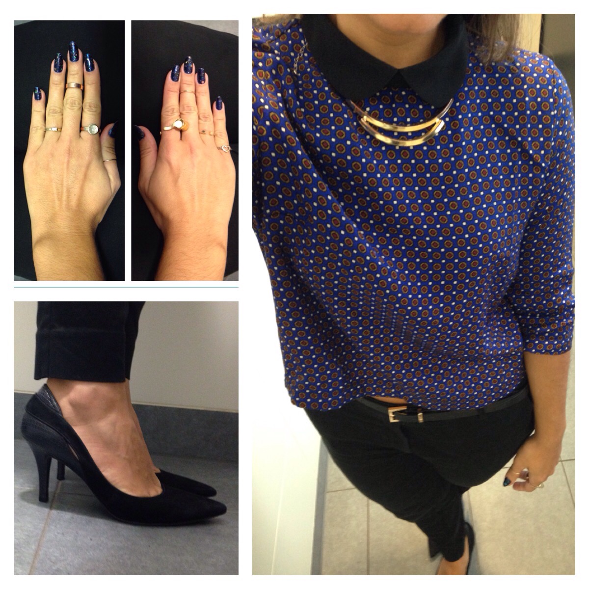 Black trousers from H&M, patterned blur blouse with Peter Pan collar from Forever 21, black court shoes from Viviana, necklace from New Look, rings from Zena & Me, H&M, Forever 21 and Topshop.