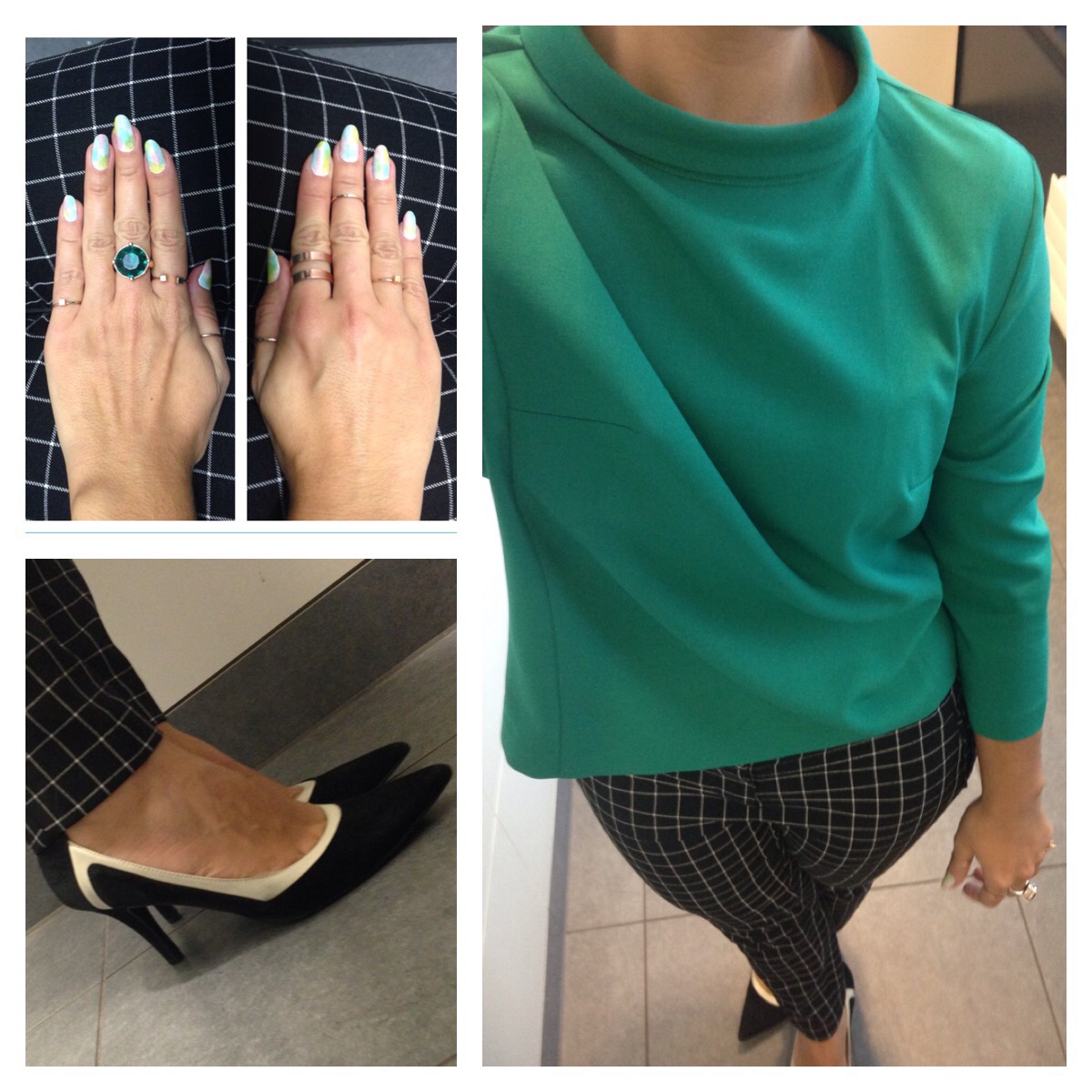 Green blouse and black and out check trousers from Primark, black and white court shoes form Viviana, rings from H&M, primark, New Look.