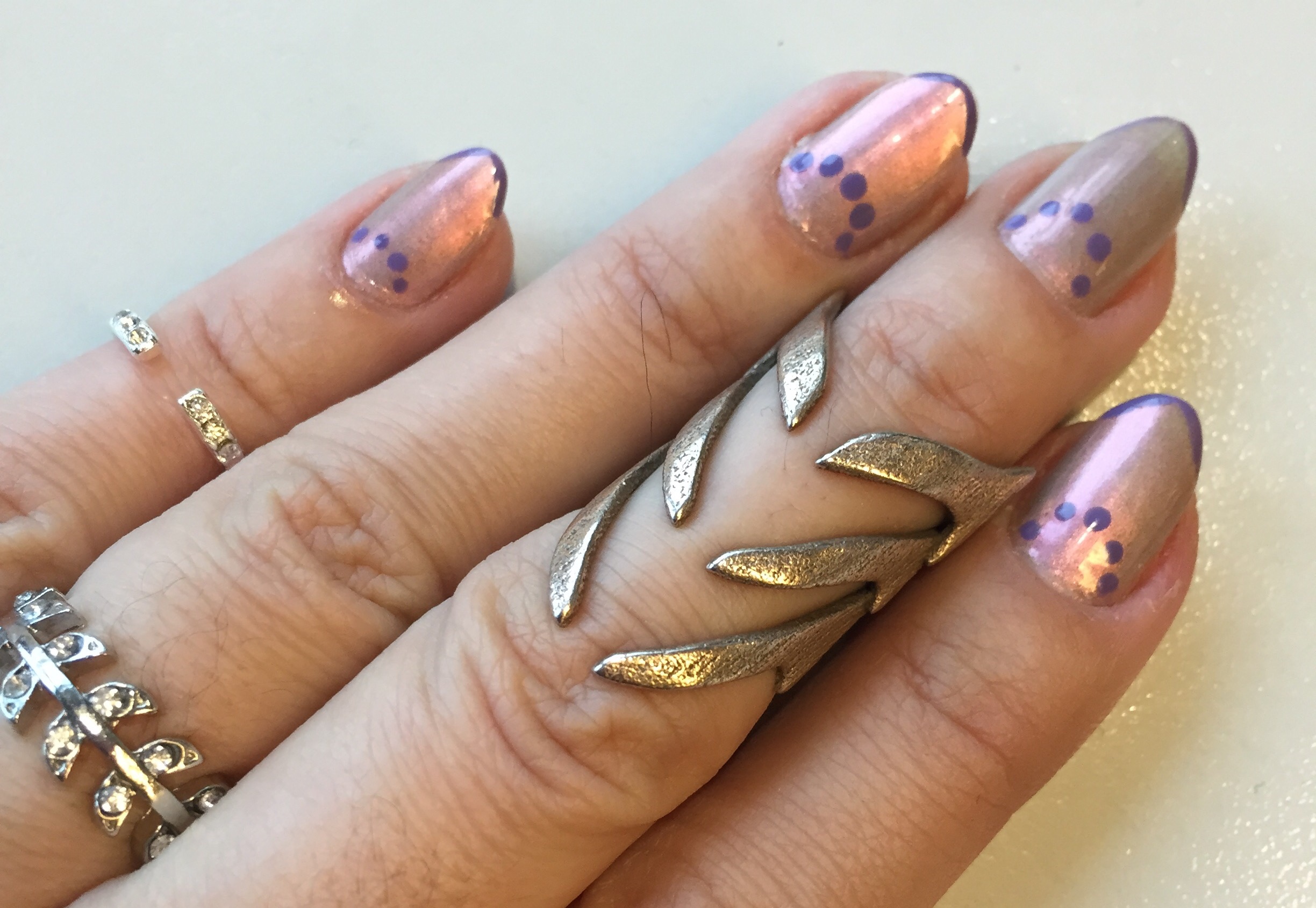 Then using a dotting tool, I added a dotted half moon to all of my nails, as well as a tip, using the polish brush itself, using Make Up Gallery Parma Violet.