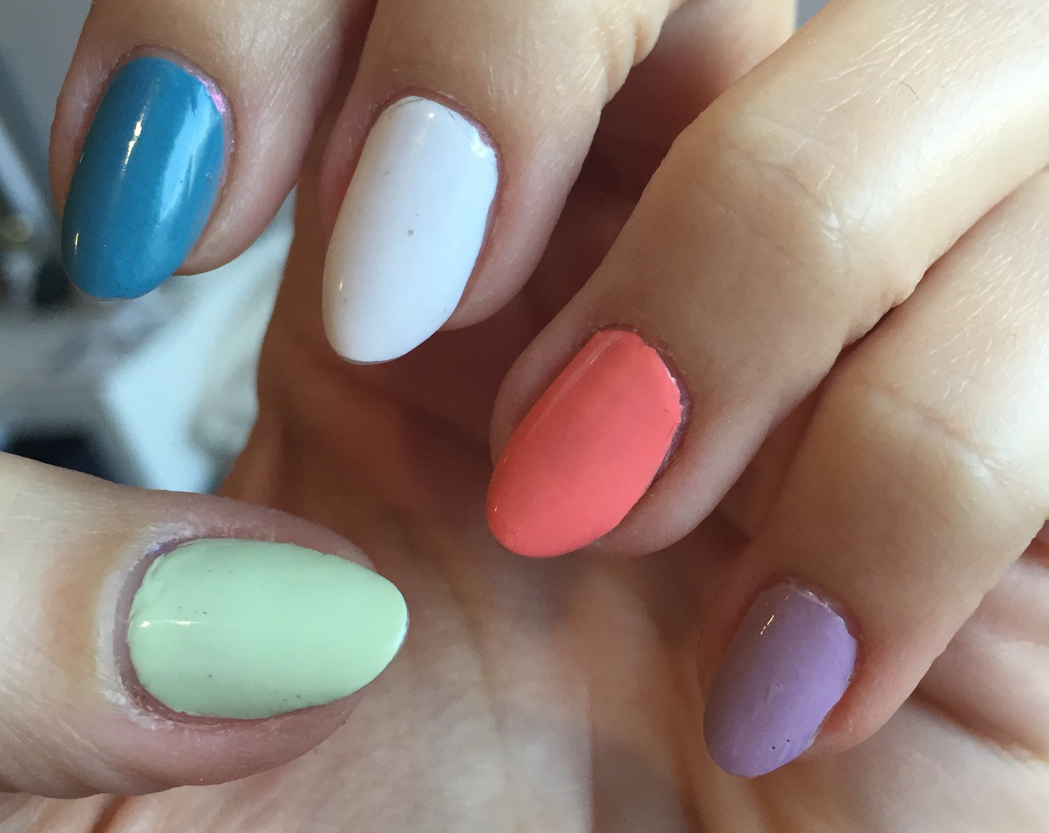 From thumb to pinky, two coats of each: Apple Blossom, Sea Foam, Snow White, Sunkissed and Moroccan Nights.