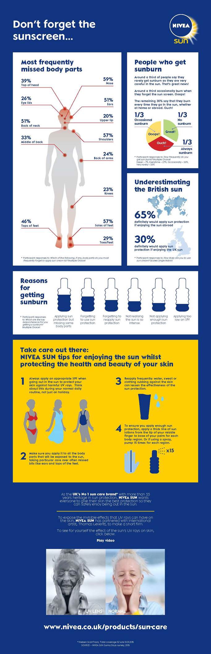 This summer Nivea is working extra hard to educate people about sun protection, and not only when they go on holidays: even in the UK where mega sunny days are quite rare – it might be grey, but the are still coming through and will cause damage! The infographic below is a good picture of it and offers great tips.