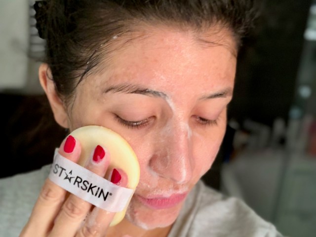 Pop the foil open, add a few drops of water, squeeze the puff a couple times inside the packet and then use it to scrub the whole face for about 2-3 minutes.