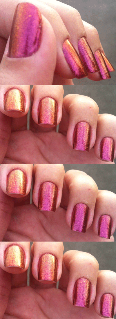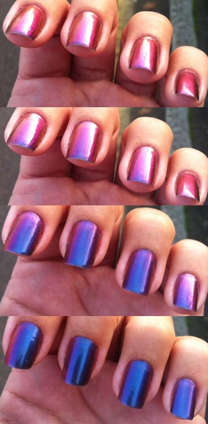 It consists of two polishes on a double ended brush; one is gunmetal grey, super sparkly and the other one is an iridescent topcoat. Together, they become a very pretty, although subtle, duochrome which varies from a light, grey-ish blue to darker blue and then to lilac and pink. Sometimes, depending on the light, you can get a glimpse of the grey, but maybe because I just used one coat of each. The reason for that is because the polish builds up quite thick. I had some problems with bubbles, when adding a third coat (second of topcoat), so removed it all and applied again, this time settling for less.